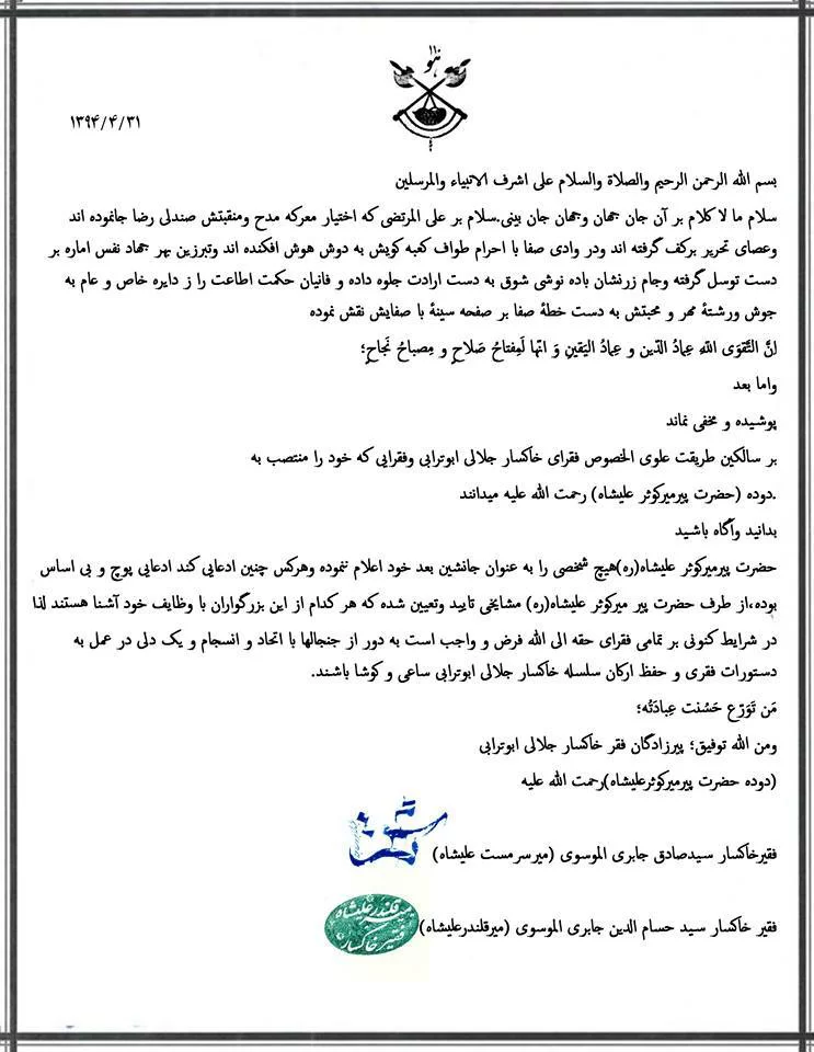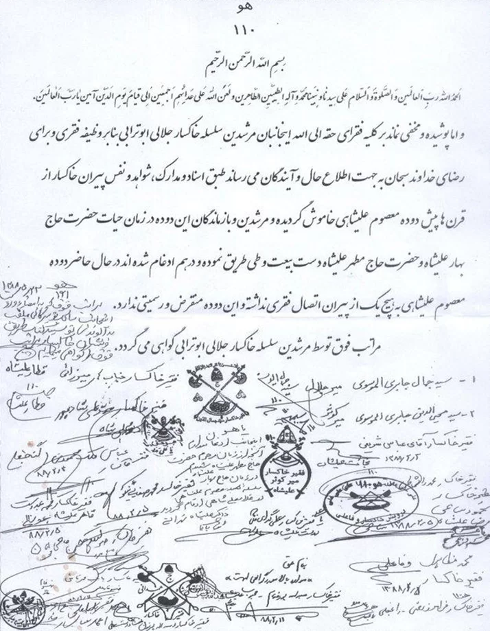 با توجه به استشهادیه زیر که توسط اغلب مشایخ سلسله خاکسار جلالی ابوترابی امضاء و تایید گردیده است، بازماندگان فرقه معصومعلیشاهی بعد از بهارعلیشاه و مطهرعلیشاه به هیچ یک از پیران، اتصال فقری نــــدارند. البته برخلاف این استشهادیه، بعضی مدعی جانشینی شدند و حتی یکی از امضا کنندگان نامه فوق، مدعی قطبیت این سلسله شد و عجیب این است که بعد از مرگ او پیروانش استشهادیه ای مشابه قبل تهیه کرده و مدعی شدند بعد از کوثرعلیشاه(حسین جابری) کسی دارای این مقام نمی باشد ولی باز هم افراد دیگری خود را در مقام قطب معرفی کردند.