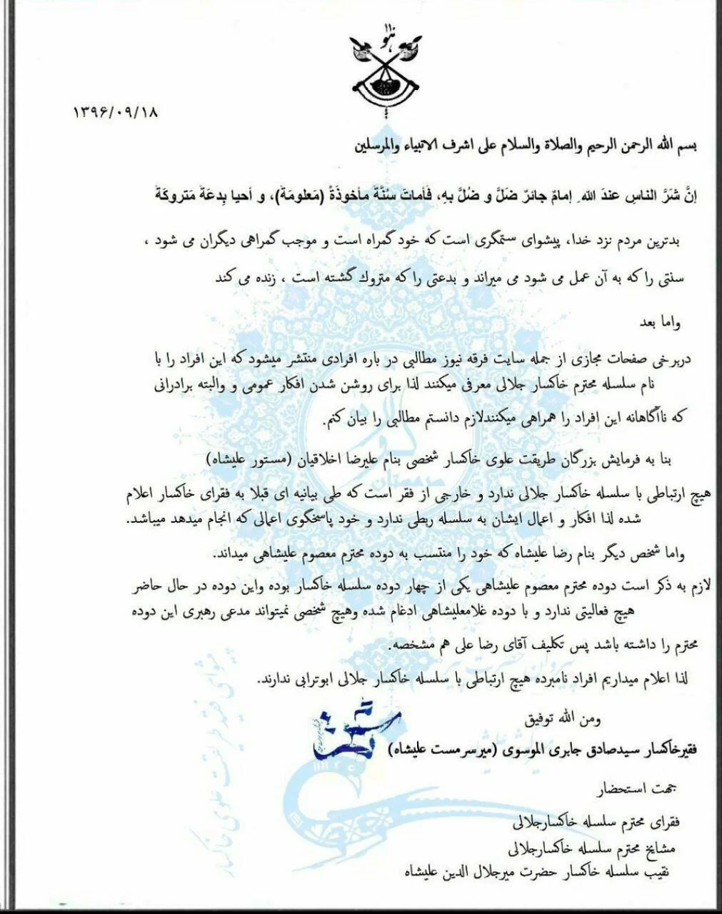 بیانیه مشایخ خاکسار مبنی بر انحلال سلسله خاکسار معصومعلیشاهی:
