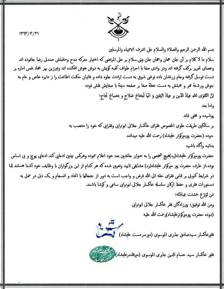 با توجه به استشهادیه زیر که توسط اغلب مشایخ سلسله خاکسار جلالی ابوترابی امضاء و تایید گردیده است، بازماندگان فرقه معصومعلیشاهی بعد از بهارعلیشاه و مطهرعلیشاه به هیچ یک از پیران، اتصال فقری نــــدارند. البته برخلاف این استشهادیه، بعضی مدعی جانشینی شدند و حتی یکی از امضا کنندگان نامه فوق، مدعی قطبیت این سلسله شد و عجیب این است که بعد از مرگ او پیروانش استشهادیه ای مشابه قبل تهیه کرده و مدعی شدند بعد از کوثرعلیشاه(حسین جابری) کسی دارای این مقام نمی باشد ولی باز هم افراد دیگری خود را در مقام قطب معرفی کردند.